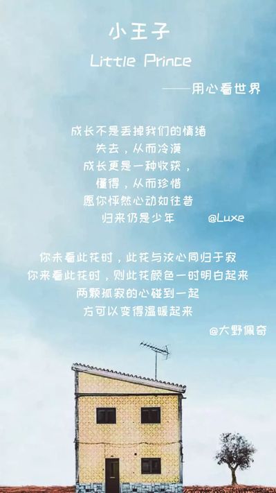 《小王子》的感动在纯。纯真、纯思、纯情。几乎所有人都曾是个小王子,然后被社会一遍遍地洗脑“这是顶帽子…这是顶帽子…”于是这个小王子也就被毒蛇咬了,去了。圣·埃克苏佩里唤醒的是我们儿时最烂漫的梦,是漫天五彩的肥皂泡,与夜里抱着的绒娃娃。这些事儿与冷暖饱食无关,但却是我们深夜梦呓时反复咀嚼的成长初梦。