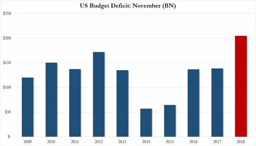①现状:美国财政部13日发布的报告显示,11月美国联邦政府财政赤字达2049亿美元,较去年同期增长48%。美国财政部当天发布的月度财政报告显示,11月美国联邦政府财政收入2059.61亿美元,同比下降1.2%;财政支出4108.64亿美元,同比增长18.4%。