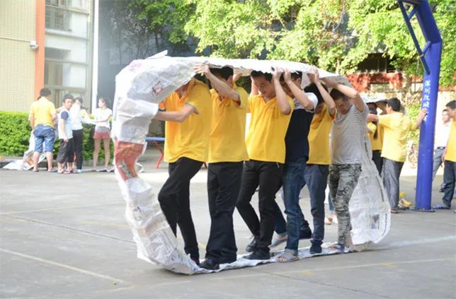 规则:每个部门要在起点处利用报纸和胶带制作一个可以容纳5人的封闭式大圆环,将圆环立起来后选出5人站在圆环上边走边滚动大圆环,直到最后一人通过终点为止,用时最短的队伍获胜。