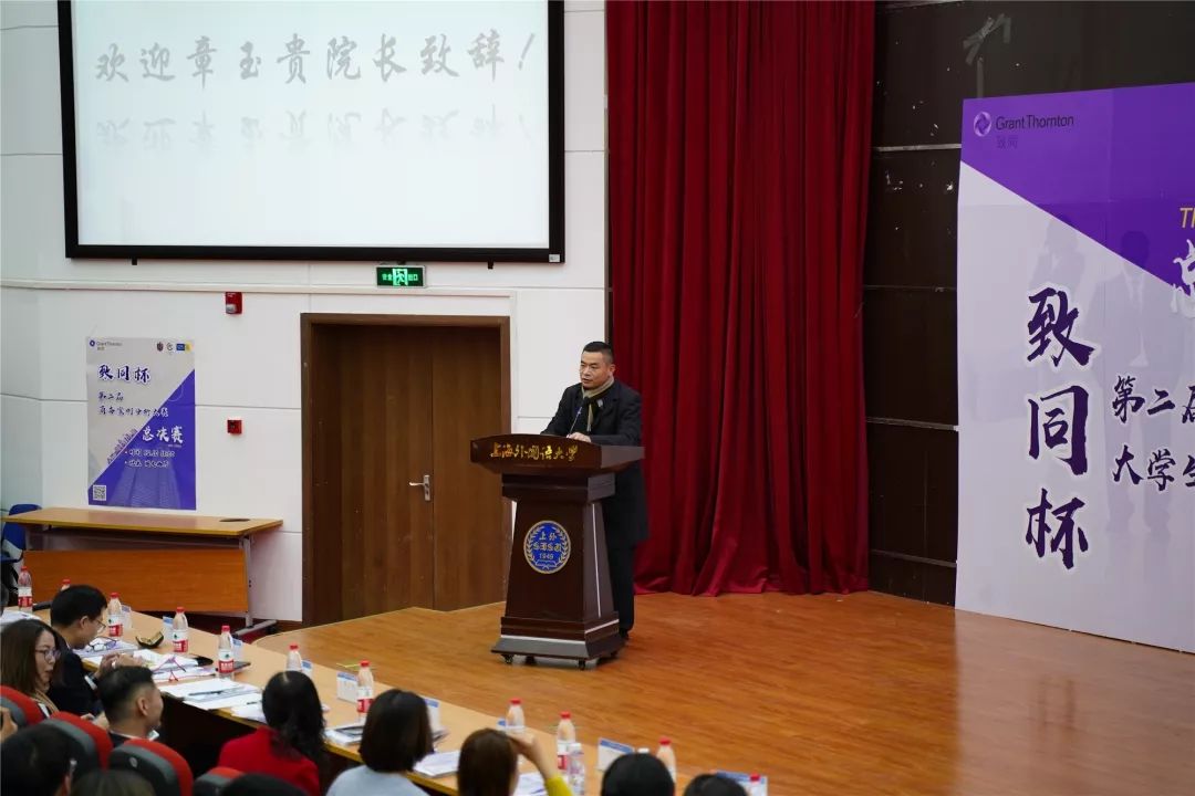 上海外国语大学国际金融贸易学院院长章玉贵老师为比赛致辞。他对致同杯案例分析的大赛举办给予了充分的肯定与支持。他表明学院对综合性金融人才的重视与培养,并预祝各位参赛选手都能在比赛中一展风采,取得佳绩。