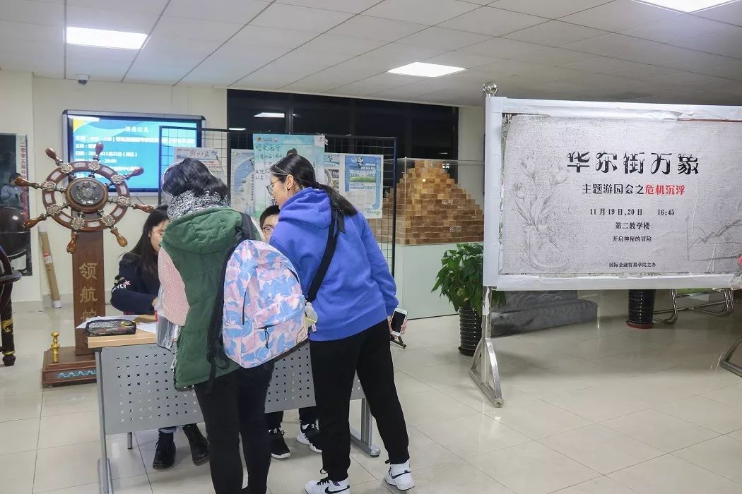 2018年11月21日与22日的下午,由国际金融贸易学院人力部主办的“华尔街万象”主题游园会在二教顺利举行。此次密室游园会吸引了近300名同学报名参加,深受欢迎。
