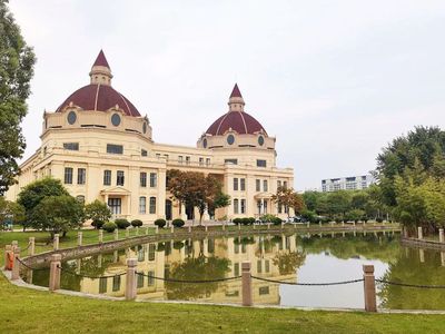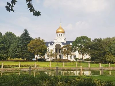 大礼堂的湖边,有一个不知道名字的教学楼,夕阳西下的时候光线照在玻璃上特别好看(国贸 碳水十字架)