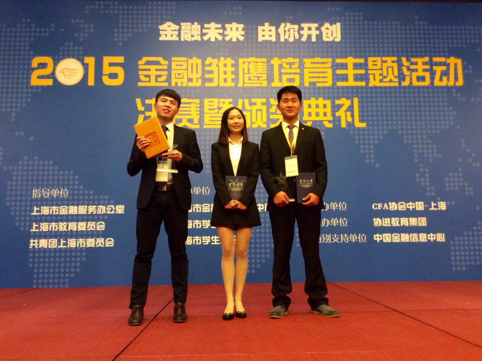 11月21日,第一届“金融雏鹰培育”主题活动决赛在陆家嘴中国金融信息中心三层落下帷幕。上海外国语大学2015级金融专业硕士研究生王定培、周静茵、李哲同学表现突出,斩获佳绩。周静茵和王定培同学获得“年度十大杰出金融雏鹰”奖,李哲同学获得“优秀金融雏鹰”奖,王定培同学更是因为展示赛的出色发挥获得“风采之鹰”奖。