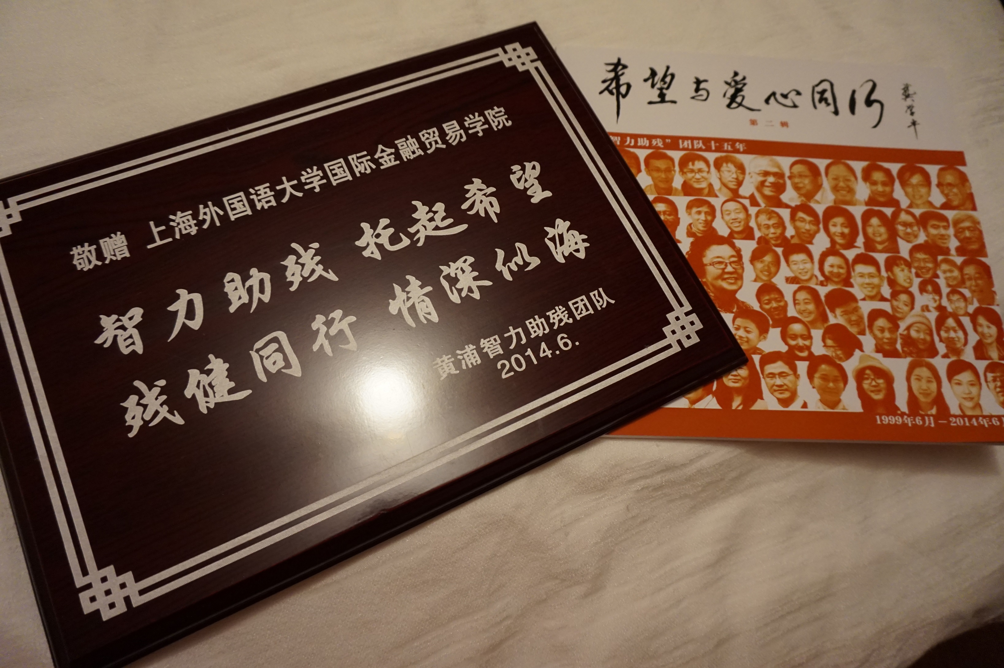 2014年6月7日下午,“希望与爱心同行——黄浦智力助残团队成立十五周年座谈会” 在上海市残联康复中心底楼多功能厅召开。上海市肢残人协会主席、市残联主席团副主席、市政协常委徐风建,上海市精神文明办副主任姜鸣,黄浦区副区长吕南停出席了座谈会,我校国际金融贸易学院党总支书记忻炯俊作为唯一一所受邀的高校代表也出席了本次座谈会。金贸学院同时被授予“智力助残,托起希望;残健同行,情深似海”纪念奖牌。
