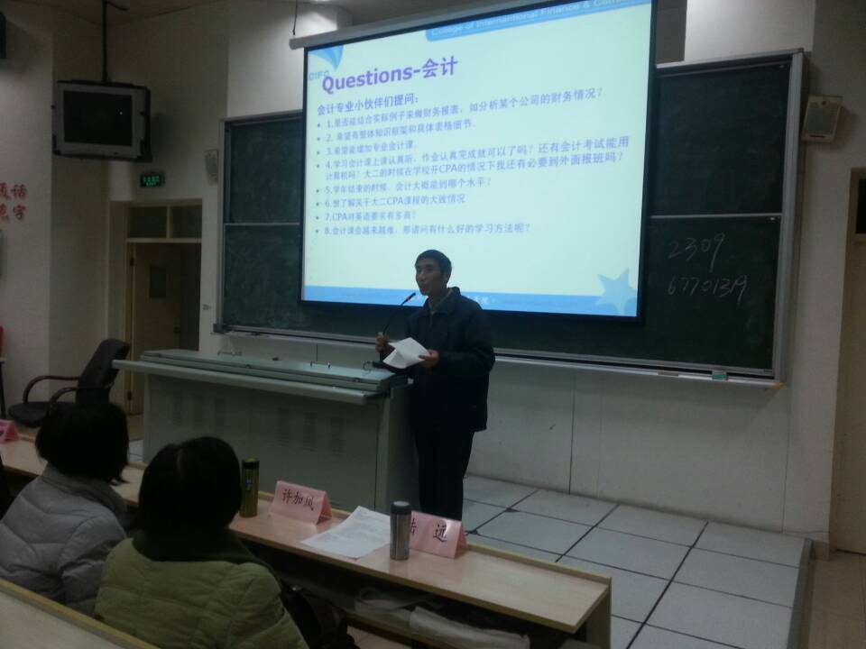 为让新生尽快适应大学的学习生活、改善学习方法、提高学习效率,以及培养良好的学习习惯,金贸学院于12月2日下午5时在2157举办了13级全体师生学习方法经验交流会。副院长张瑾老师、仓勇涛老师,英语教学部主任陆远老师,一年级全体精读、数学、会计老师等共计12名老师出席了本次交流会。同学们踊跃提问,老师们热情解答。问题遍及各科的学习方法、学习技巧、复习方法及课后补充材料。此外对于学生较为关心的热点问题如考证、出国、就业、专业内课程之间的联系、以及学习工作的时间平衡等等,各位老师也逐一详细解答。