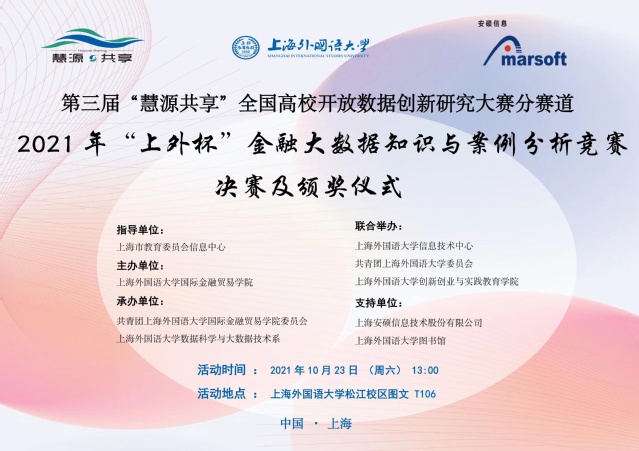 2021年10月23日,2021年“上外杯”金融大数据知识与案例分析竞赛决赛及颁奖仪式于上海外国语大学松江校区图文T106如期举行。