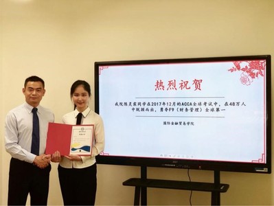 ACCA项目班开设至今,学院学生在ACCA全球统考中屡获佳绩。在2015年6月举行的ACCA全球考试中,华冰清同学获得P7(高级审计与认证业务)科目中国内地单科第一;在2017年12月举行的ACCA全球考试中,陈灵霖同学在F9(财务管理)中以92分高分夺得全球第一桂冠;在2021年12月举行的ACCA全球考试中,简怡君同学取得AFM(高级财务管理)科目中国内地第一名。