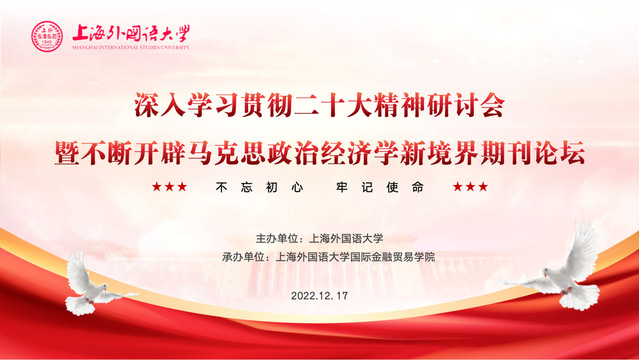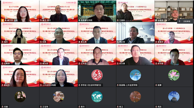 2022年12月17日,时值全国上下深入学习宣传贯彻党的二十大精神之际,上海外国语大学采用线上会议方式召开了“深入学习贯彻二十大精神研讨会暨不断开辟马克思政治经济学新境界期刊论坛”。来自中国社科院、上海社科院、复旦大学、中国人民大学、华东师范大学、上海财经大学、上海外国语大学、华东政法大学、上海对外经贸大学等高校科研院所的专家学者以及《中国社会科学》《马克思主义研究》《经济理论与经济管理》《经济学动态》《学术前沿》《东岳论丛》《上海经济研究》《毛泽东邓小平理论研究》和中国人民大学书报资料中心《理论经济学》等近30家期刊负责人或资深编辑共60余人在线参会。开幕式由上海外国语大学国际金融贸易学院院长章玉贵教授主持。