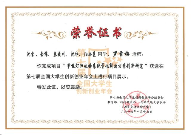 由国家教育部、科技部联合主办的第七届全国大学生创新创业年会10月18至19日在西安交通大学举行。教育部高教司副司长韩筠、科技部政策法规司邱成利、陕西省教育厅厅长李兴旺等出席开幕式并致辞。年会吸引了来自全国近300所院校、700余名师生代表参与。240项国家级大学生创新创业训练计划项目参与大会交流,项目覆盖了理、工、农、医、文、法等12个学科门类。我校国家级大学生创新训练项目《节能灯回收的系统量化解决方案创新研究》从提交的近2000项成果中脱颖而出,成功入选本次年会的展板展示项目。